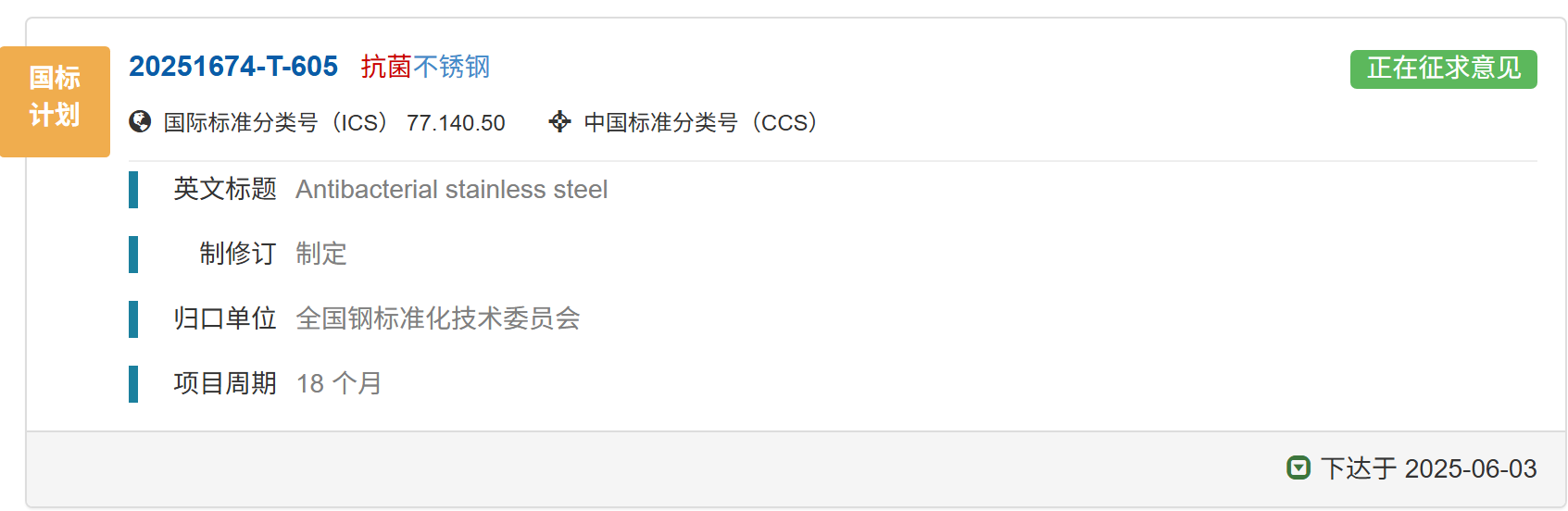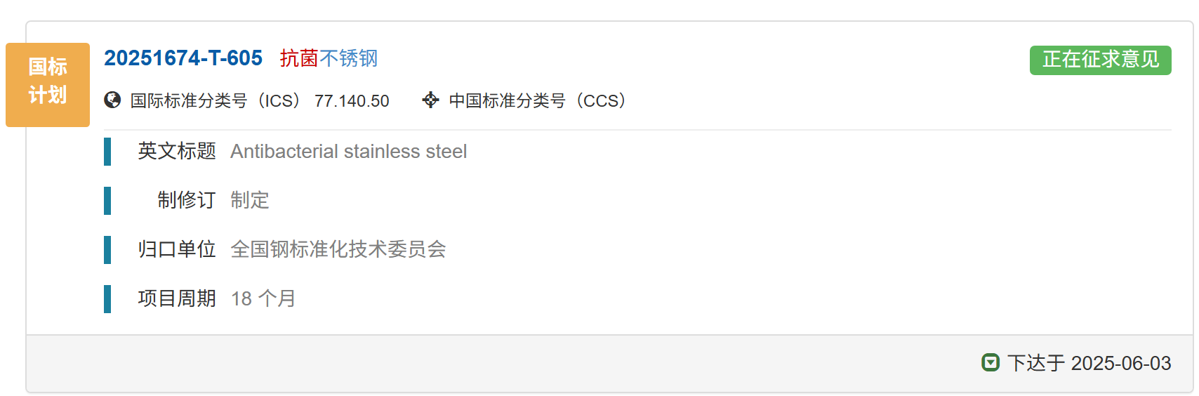 國家標(biāo)準(zhǔn)《抗菌不銹鋼》正在征求意見中,歡迎報(bào)名成為參編單位并提出修改意見和建議。01 國家標(biāo)準(zhǔn)計(jì)劃《抗菌不銹鋼》已下達(dá)國家標(biāo)準(zhǔn)計(jì)劃《